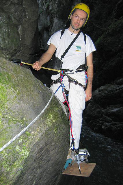 La sangle de l'appareil est accrochée à une longe,